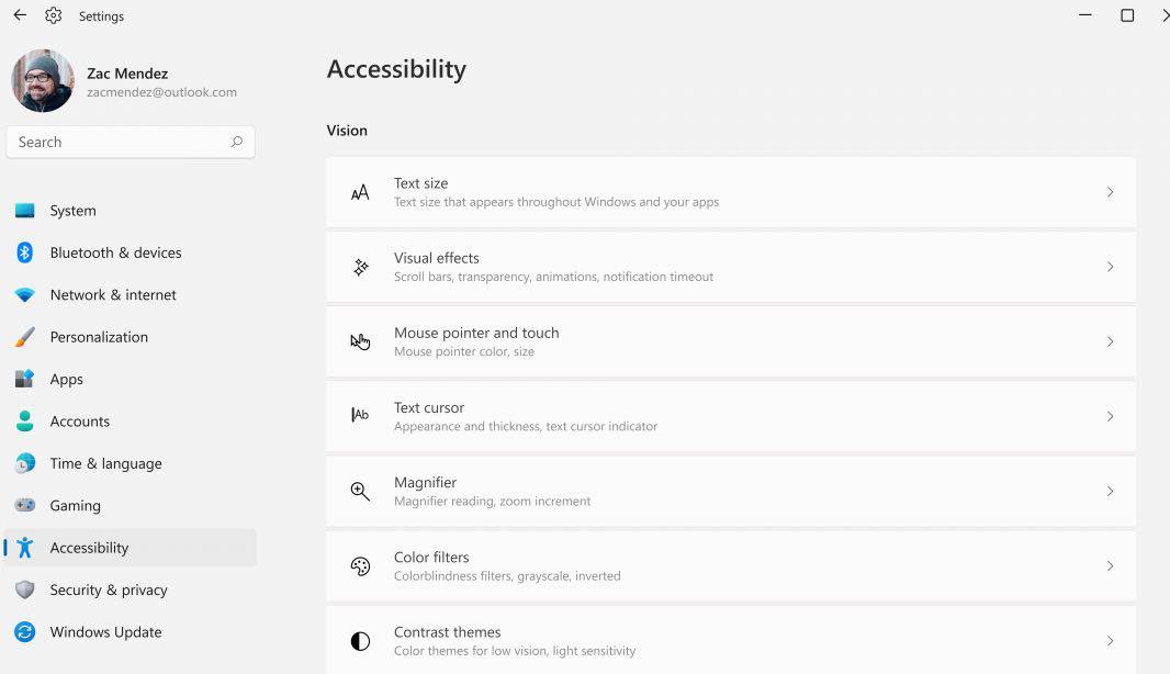 Above: Windows 11 accessibility settings. Images courtesy Microsoft.