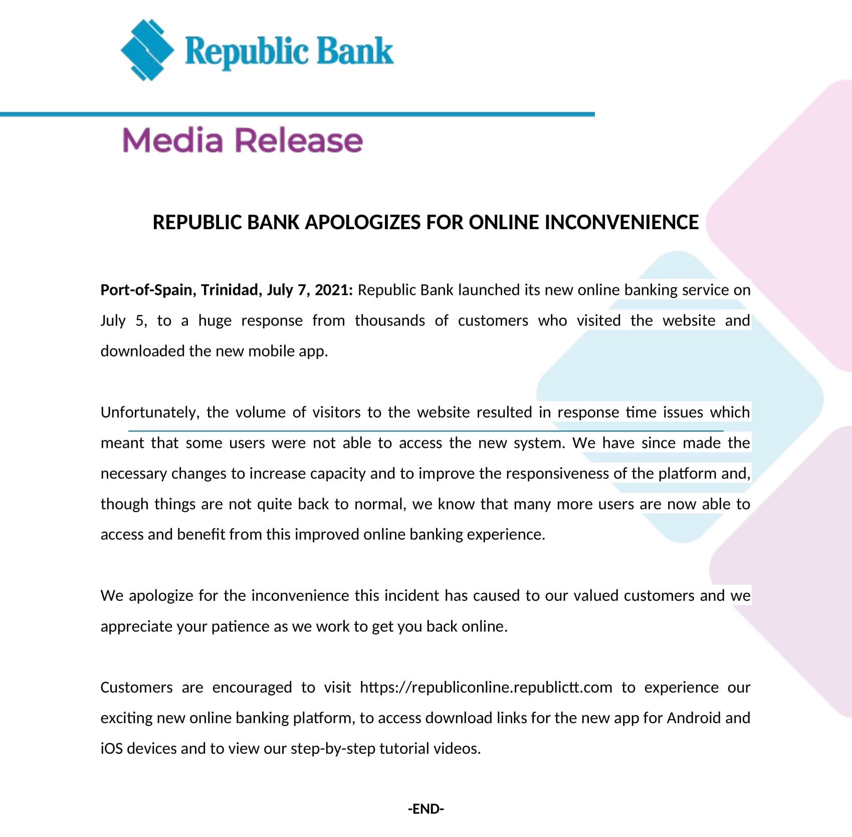 Republic Bank’s social media presence has been swamped by desperate comments, and the company has so far issued canned responses to often quite irate messages, asking customers to contact its Internet banking team at [email protected] or to call its call centre at 627-3348.