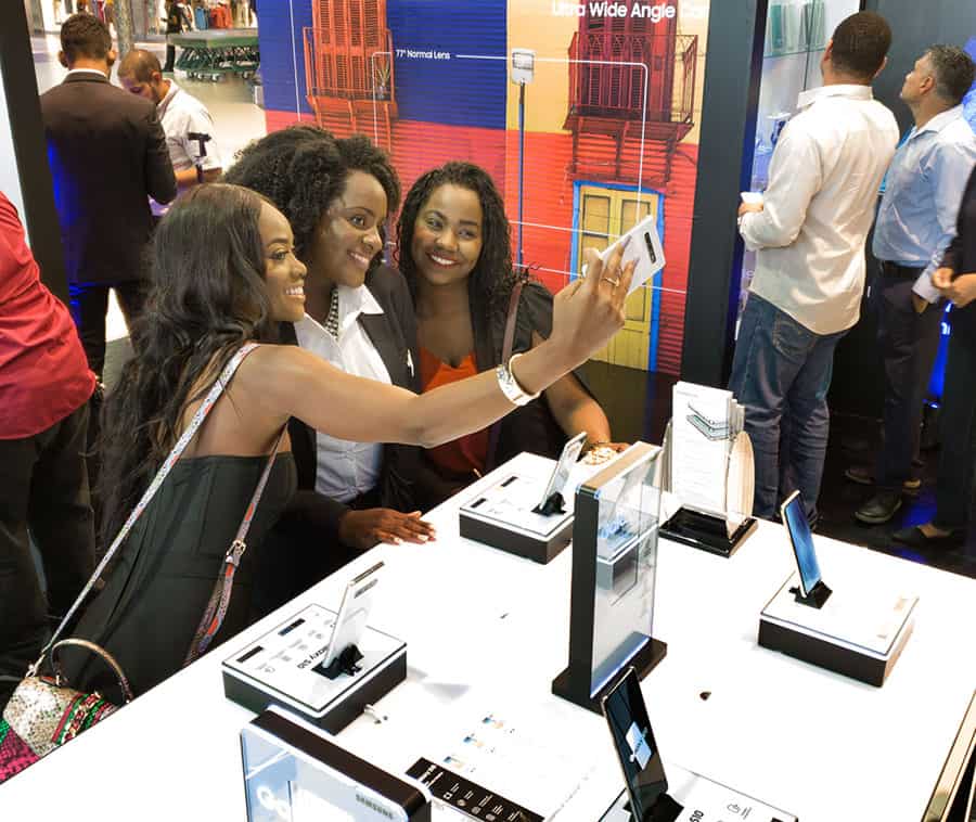 Above: Avionne Mark, Samsung Brand Ambassador, Experience Team member Hadassah Gordon and Rhesa Lessey pose for a wefie with the new wide-angle S10 front facing lens at the launch. Photo by Mark Lyndersay.