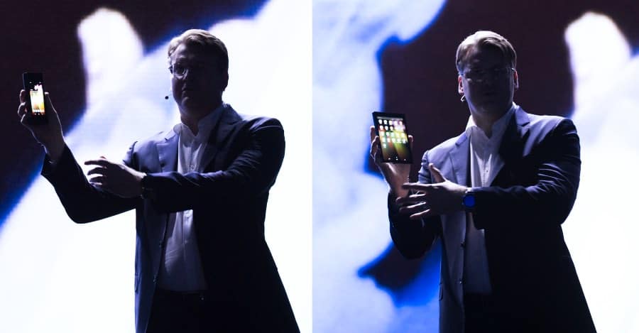 Above: Justin Denison, SVP of Mobile Marketing for Samsung, demonstrates the Infinity Flex Display. Photo courtesy Samsung.