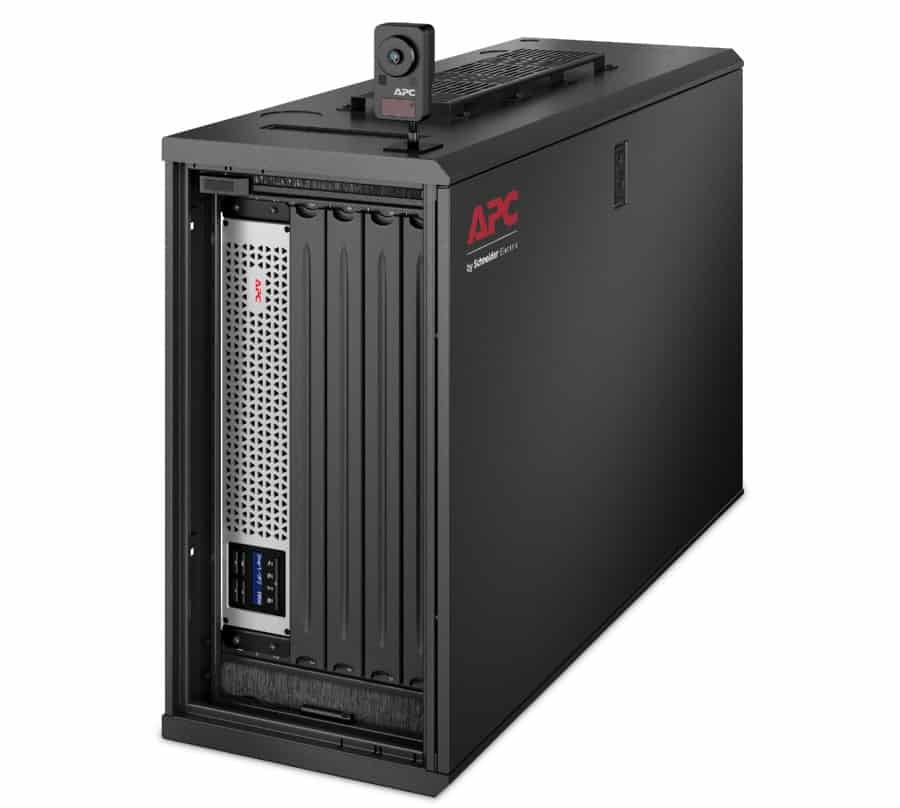 The EcoStruxure is an integrated solution in a wall-mounted rack design with a UPS installed and physical security, including webcams.