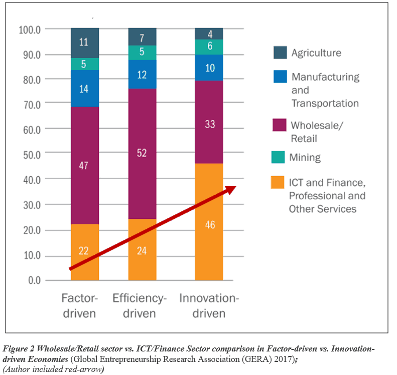 The recent GEM Report (Global Entrepreneurship Research Association (GERA) 2017) clearly illustrates the need for the State and SMEs to move aware from traditional manufacturing and domestic trade, towards innovating service-oriented industries such as ICT, Finance and other professional services (see red-arrow in Figure 2 below).