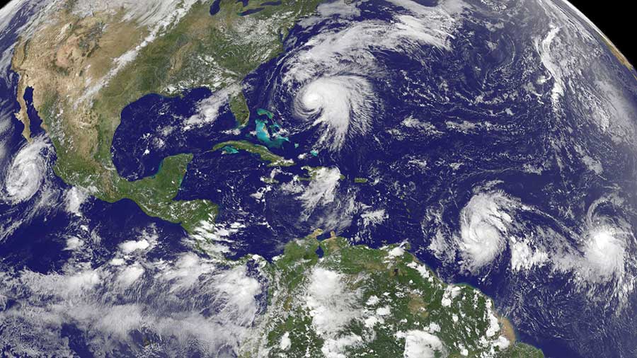 Above: Tropical weather systems Hurricane Norma, left, on the Pacific Ocean side of Mexico; Jose, center, east of Florida; Tropical Storm Maria, second from right, north of South America, and Tropical Storm Lee, far right, north of eastern Brazil, on Saturday, Sept. 16, 2017. Image courtesy NOAA-NASA GOES.