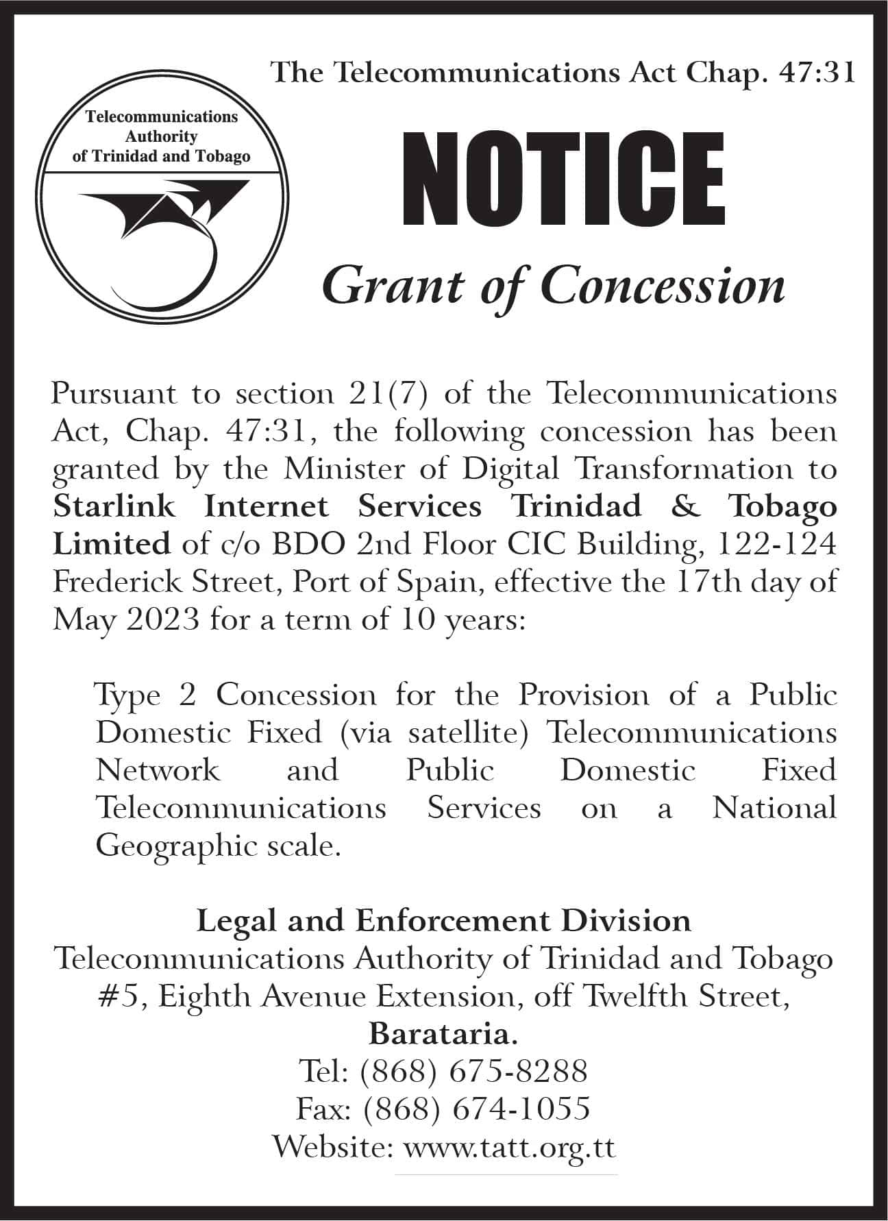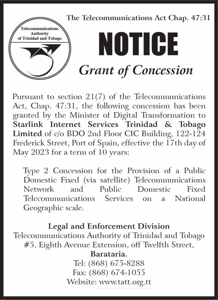 The Telecommunications Authority, operating on the advice of the Minister of Digital Transformation, has granted a ten-year concession to Starlink for the provision of satellite based connectivity, effective May 10, 2023.