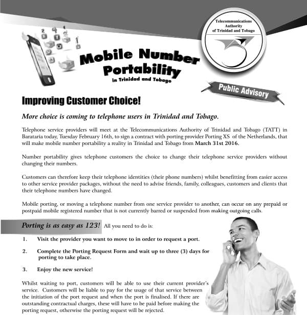 Telephone service providers will meet at the Telecommunications Authority of Trinidad and Tobago (TATT) in Barataria today, February 16th, to sign a contract with porting provider Porting XS of the Netherlands, that will make mobile number portability a reality in Trinidad and Tobago from March 31, 2016.