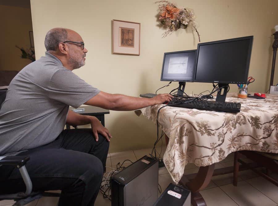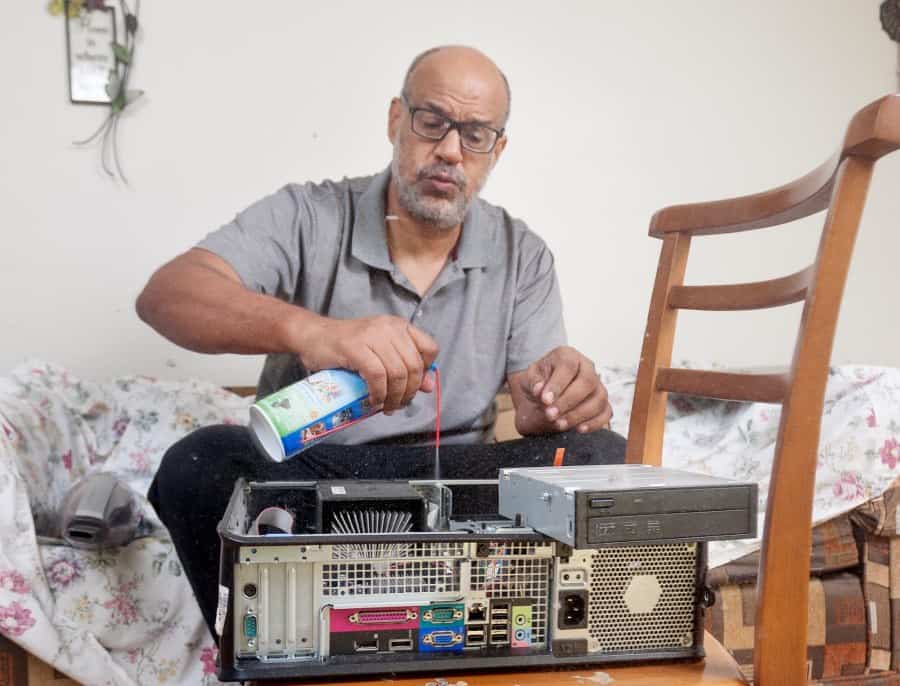 Above: Simon Fraser cleans a donated desktop system at his home. Photo by Mark Lyndersay.