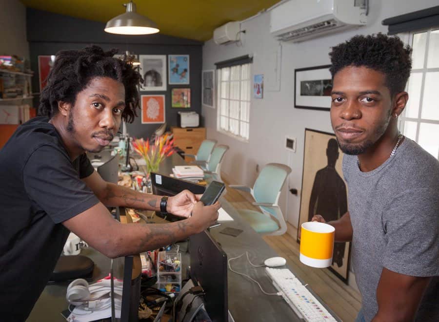 Above: Agyei Archer with Andel Husbands (background) at the shared Woodbrook workspace where Unqueue was developed. Photo by Mark Lyndersay.
