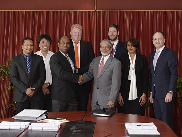 Above: Mr Cris Seecheran, Chief Executive Officer – TATT (center right) shakes hands with Charles Carter EVP Legal, Regulatory, Carrier Services and Corporate Secretary TSTT at the signing of the Number Portability agreement with PortingXS at the Telecommunications Authority of Trinidad and Tobago. Also in photo from left are: Kirk Rudder, Manager Value Added Services, Massy Communications Limited; Peter Gillette, Chairman, Open Telecom; Mr. Ronald Vlasman Chief Executive Officer, Porting XS, B.V. Chief Operations Officer, Fiachra Groarke, Digicel (Trinidad &Tobago) Limited; Narissa Mustapha General Manager; Lisa Communications Limited; Brian Collins, Managing Director Columbus Communications Trinidad Limited. Photo by Brian Lopes, courtesy TATT.