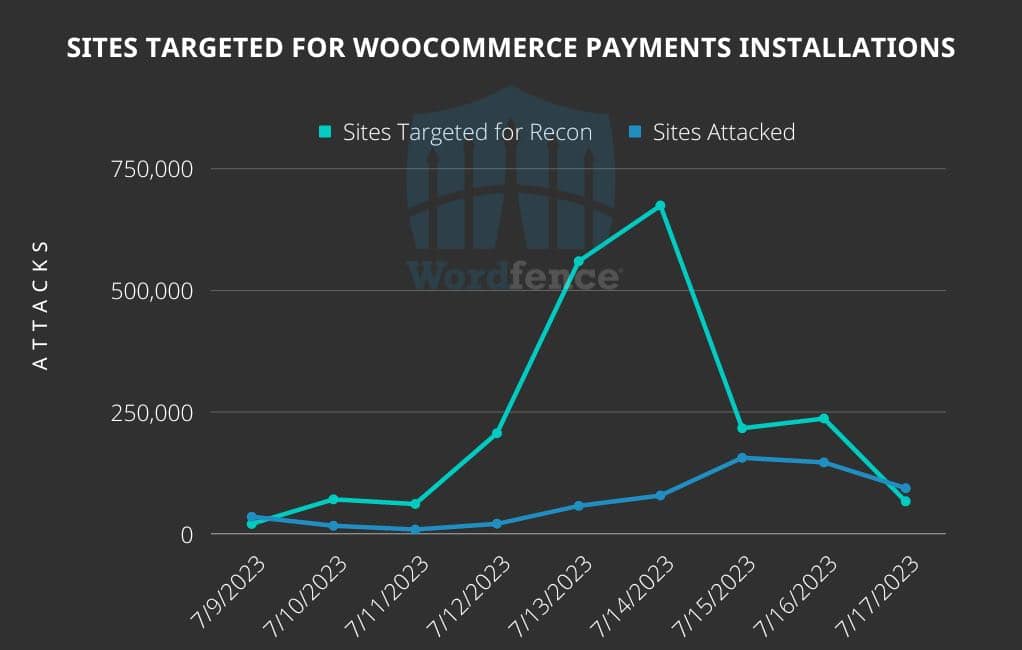 The attacks target a known vulnerablility, CVE-2023-28121, and began on July 14, 2023. Wordfence has catalogued a peak of 1.3 million attacks against 157,000 websites on July 16.